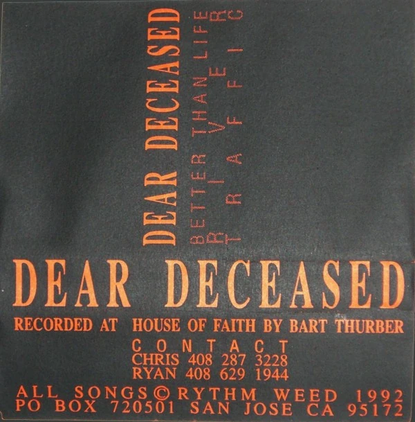 Dear Deceased formed in the early 1990s and cranked out insanely great live sets for a couple years before they dissolved. Luckily, they also recorded a demo with the ubiquitous Bart Thurber. Mitch, the bassist, went on to front Operator Generator, and George Rice (rhythm guitar) was the original bassist for High on Fire. Erik went on to be vocals for another band, Bliss of Triple Six.