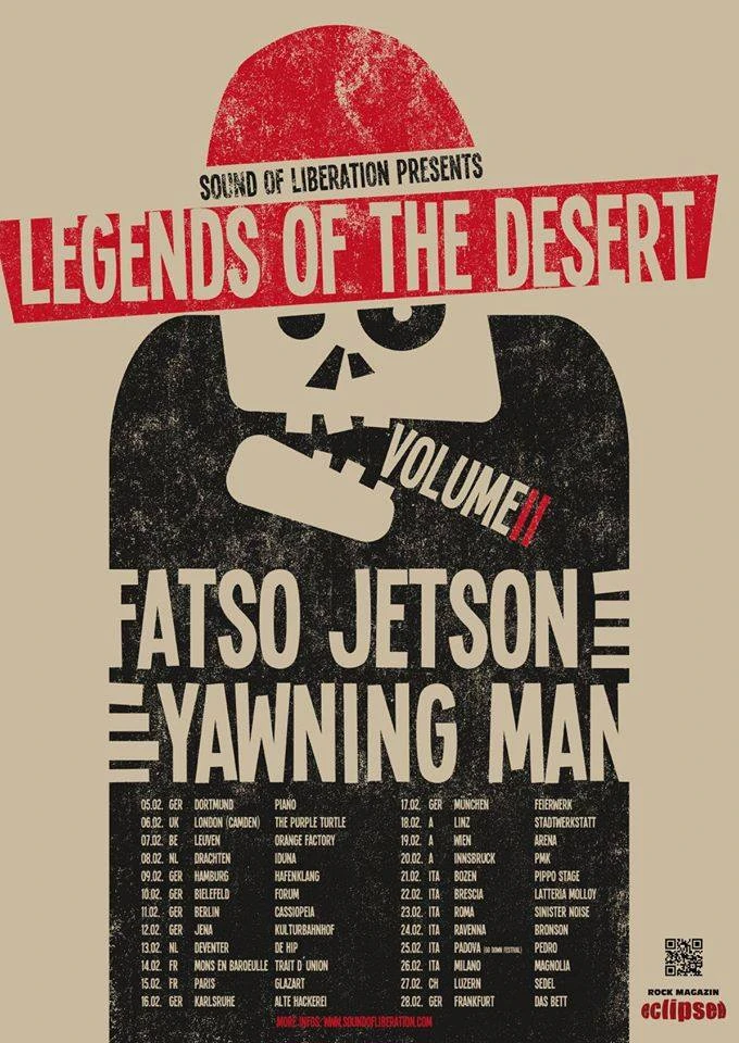 Legends of The Desert Volume II is a tour of Europe featuring Yawning Man and Fatso Jetson, celebrating two pioneers in the desert rock scene. A sequel to the band's acclaimed Legends of the Desert tour in 2013, the two bands would tour together throughout February 2015. The tour would be presented by Sound of Liberation.